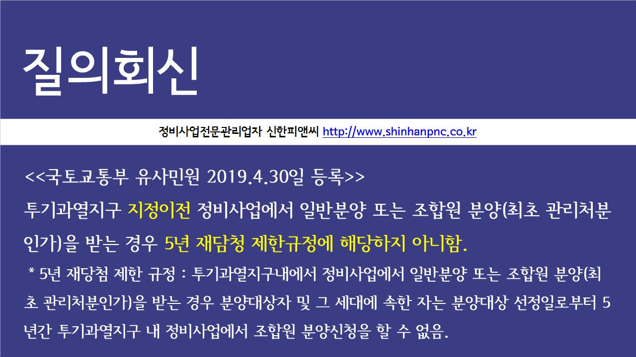 질의회신 - 투기과열지구 지정이전 정비사업에서 일반분양 또는 조합원분양(관리처분인가) 받는 경우 5년 재당첨 규적 미적용
