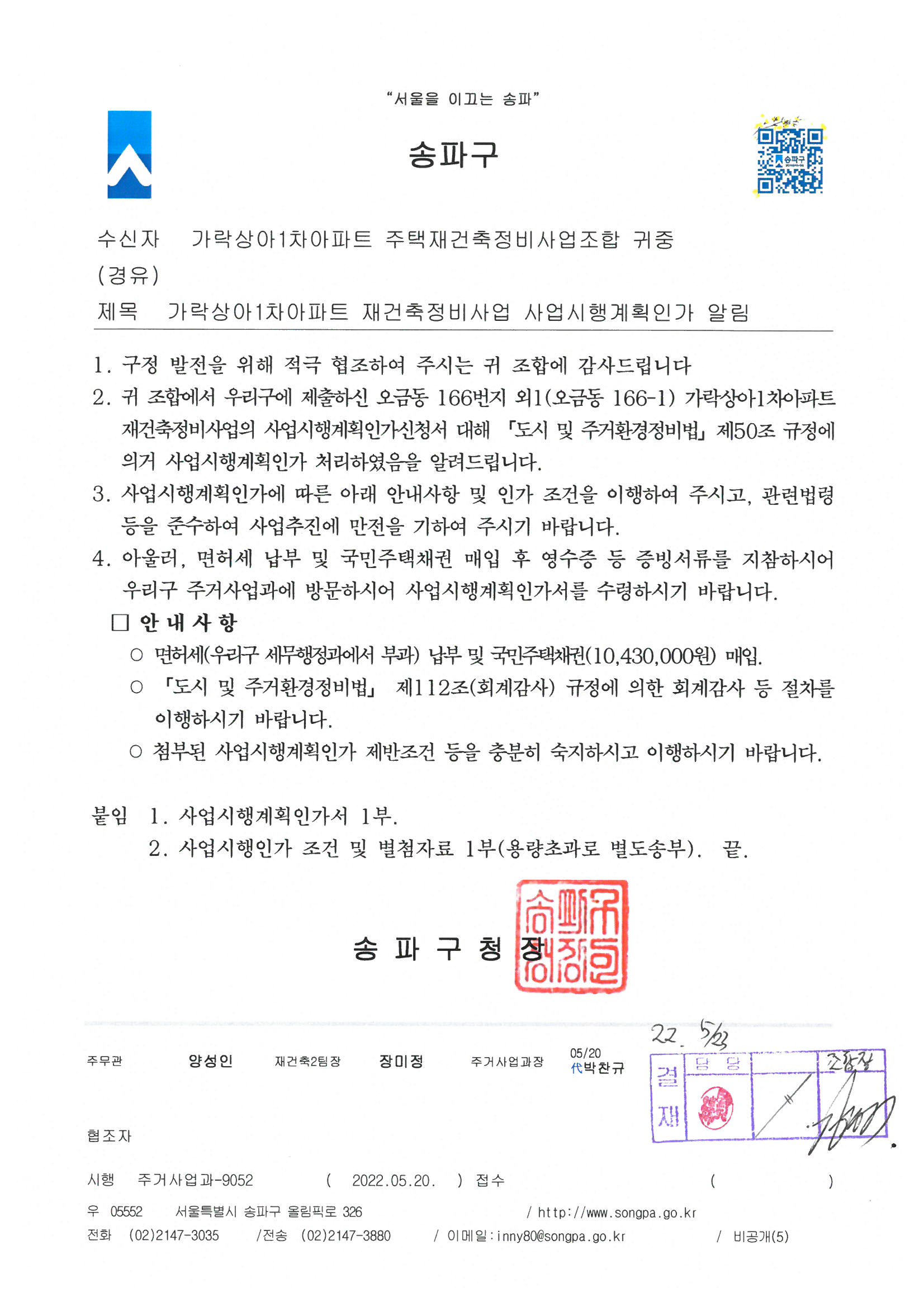 공문수신(주거사업과-9052+가락상아1차아파트+재건축정비사업+사업시행계획인가+알림).pdf (341.1 KB)